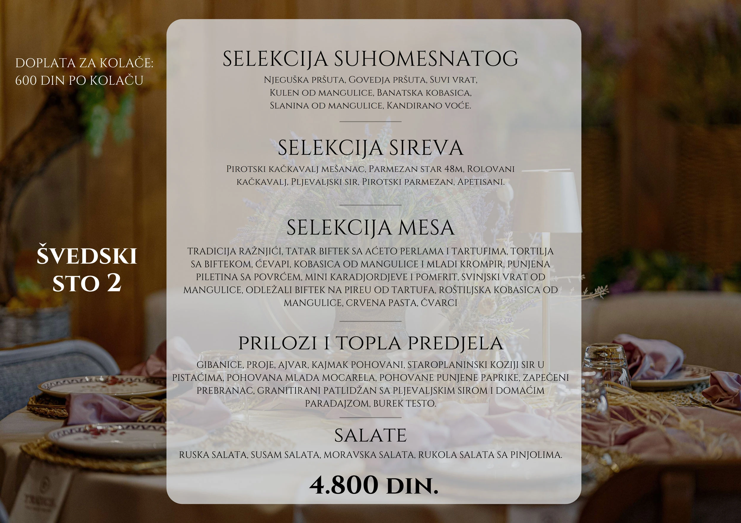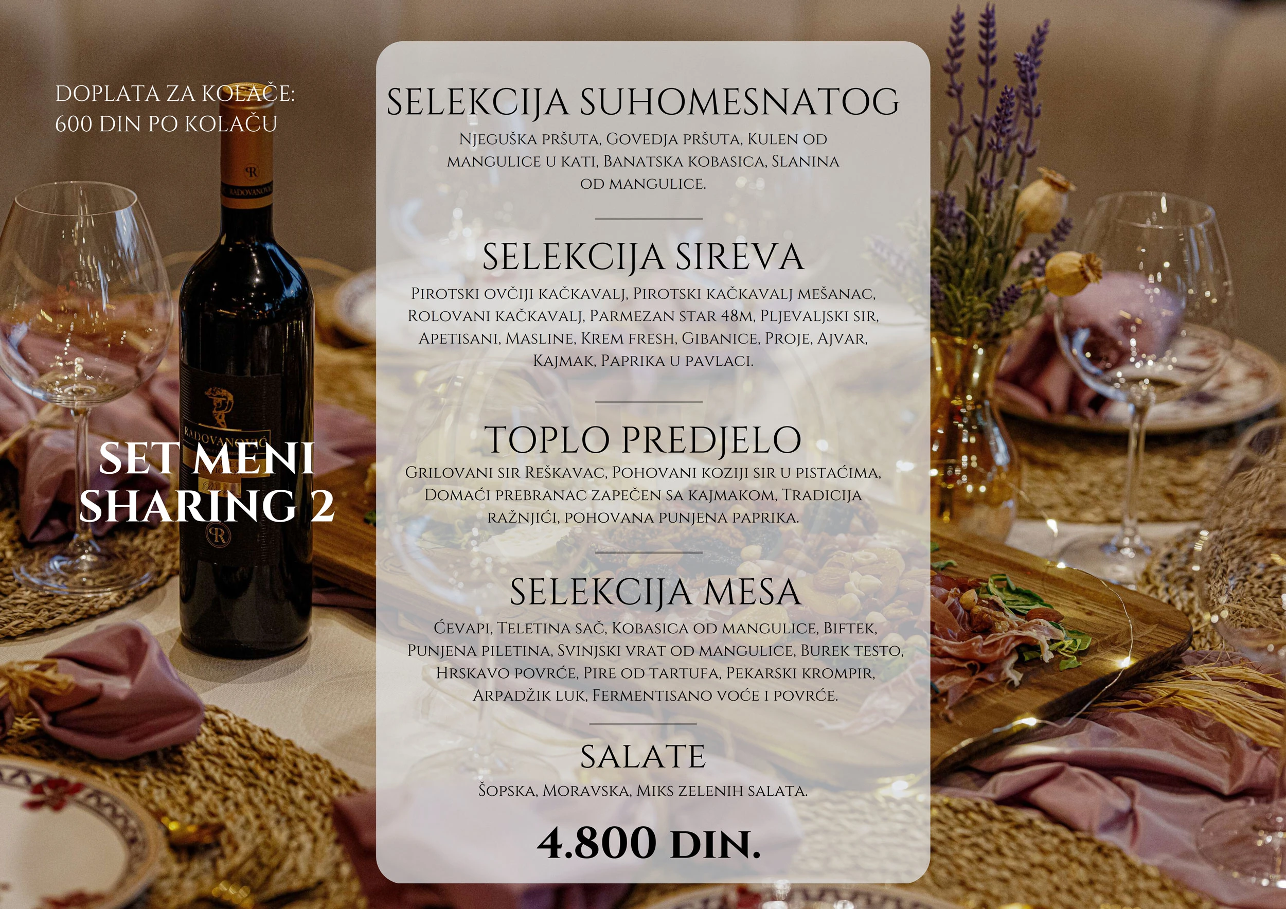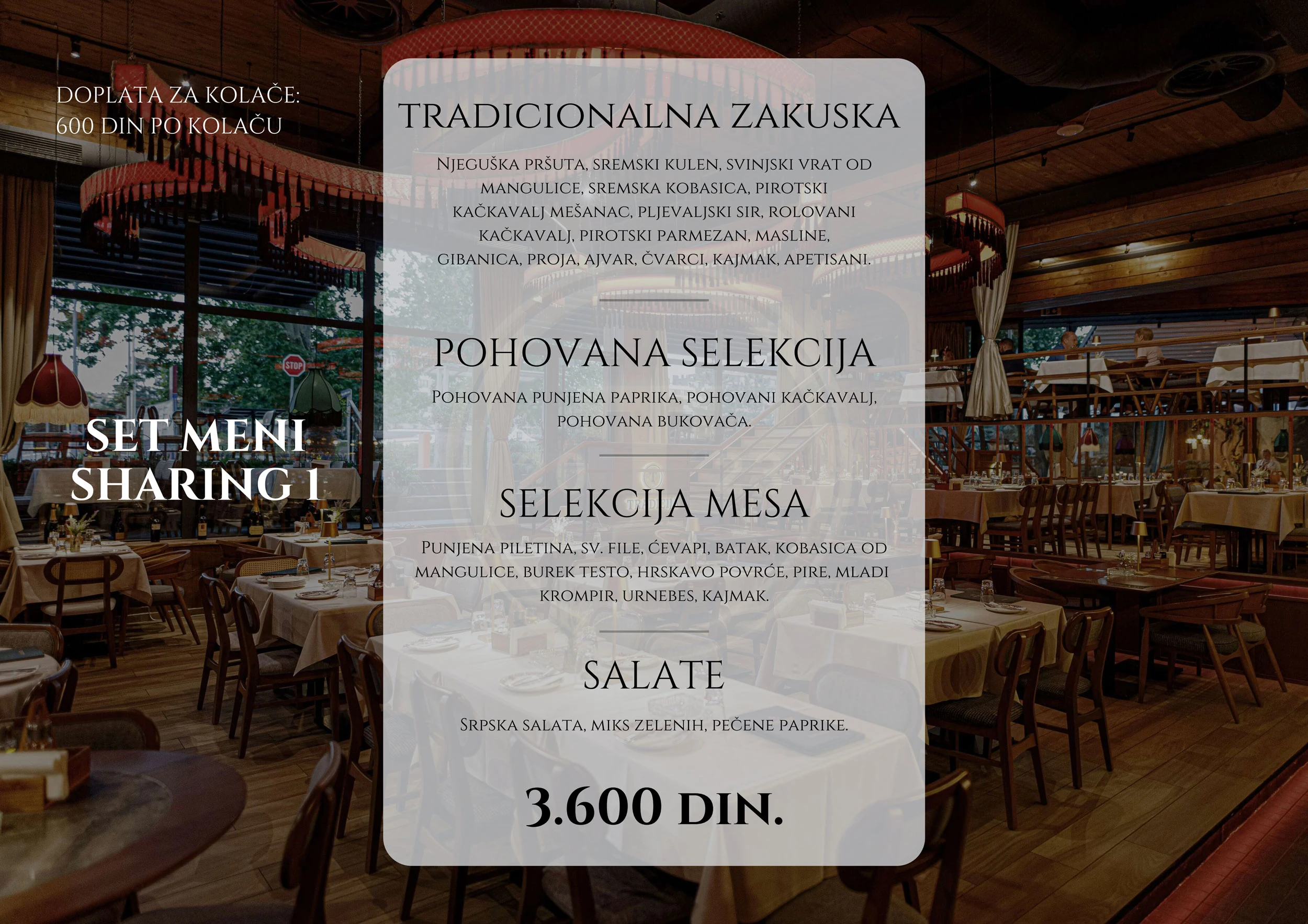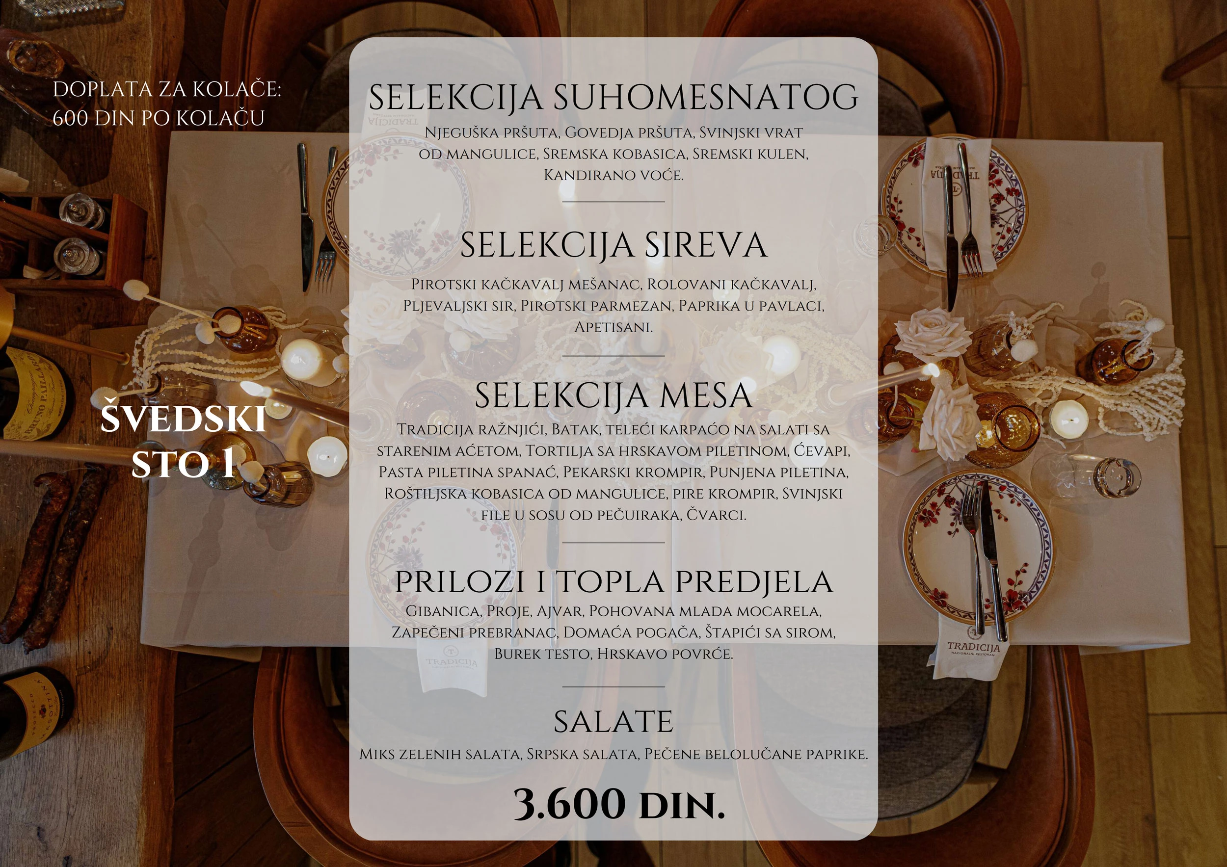 U našoj ponudi se nalaze raznovrsne set meni opcije, prilagođene različitim ukusima i preferencijama gostiju. Bez obzira kakva jela preferirate, kuvari restorana Tradicija posvećeni su pružanju gastronomskog užitka koji će zadovoljiti sva nepca.