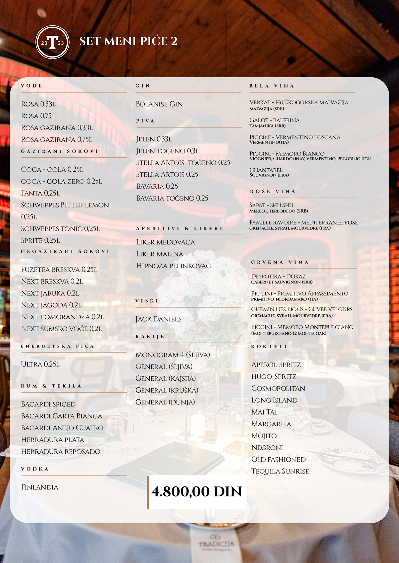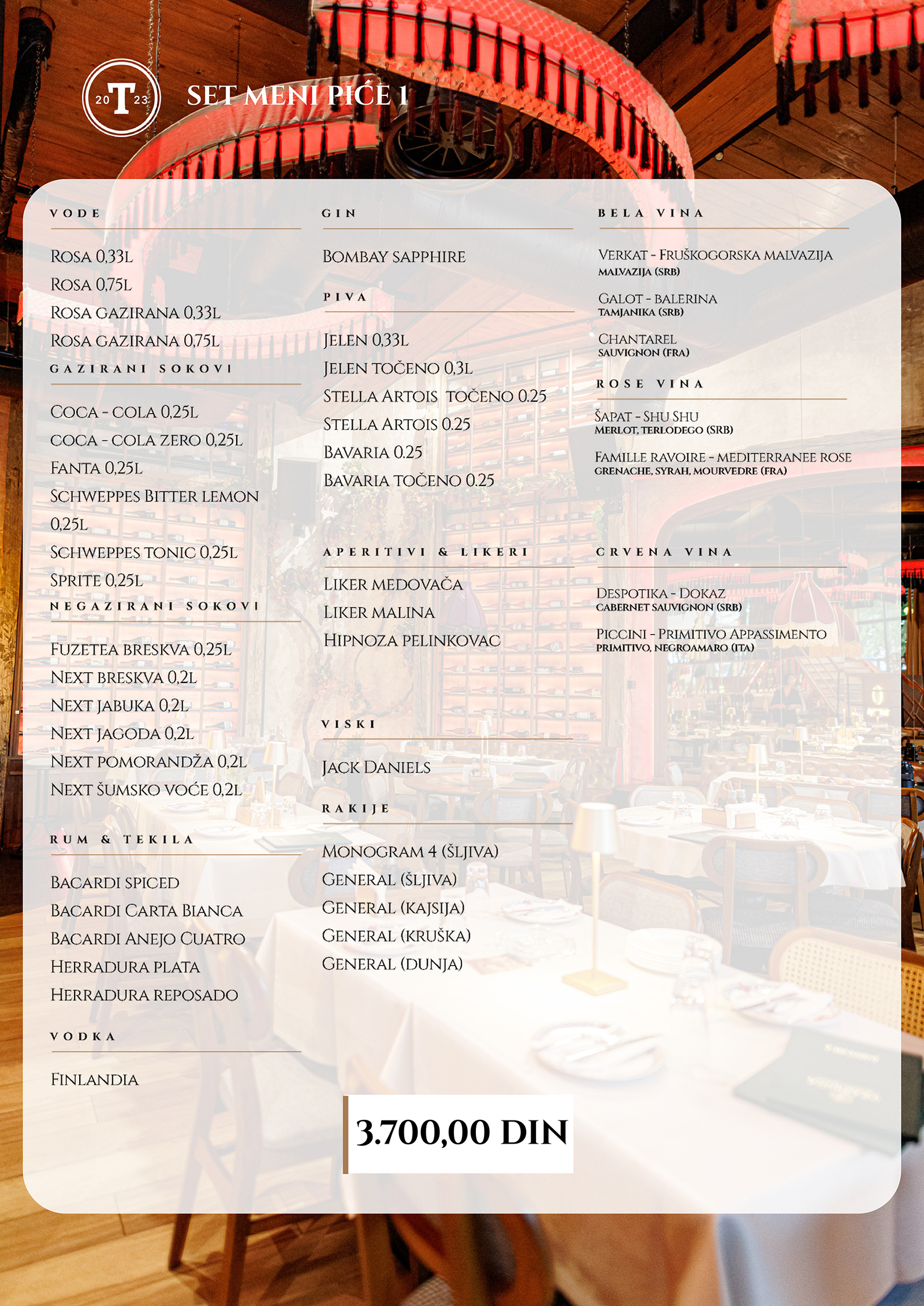 Kako bismo dodatno upotpunili vašu proslavu, nudimo vam i širok spektar pića, uključujući pažljivo odabrane pakete. Za one koji žele više fleksibilnosti, nudimo vam i opciju kombinovanja set menija sa pićem po utrošku, pružajući vam potpunu kontrolu nad izborom omiljenih pića.